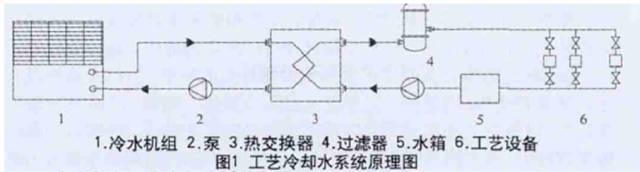 工艺冷却水系统由以下几部分组成:冷水机组、泵、热交换器、水箱、过滤器、工艺设备。如图1所示。