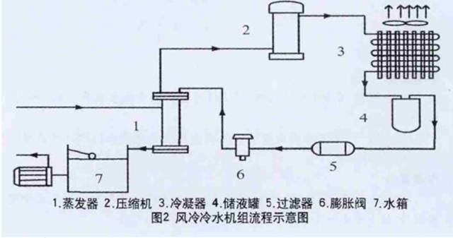 风冷冷水机组是以空气为冷(热)介质,作为冷(热)源兼用型的一体化设备。如图2所示。机组以其高效、低噪音、结构合理、操作简便、运行安全、安装维护方便等优点。